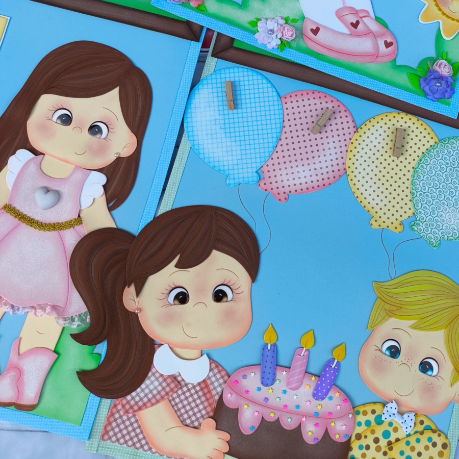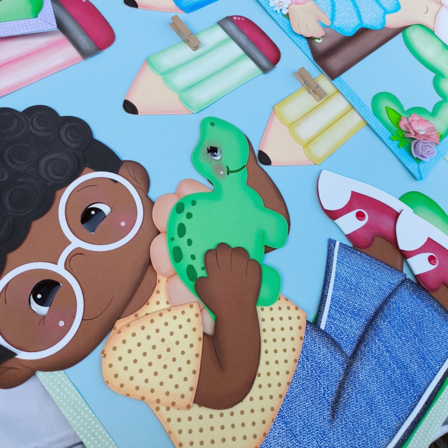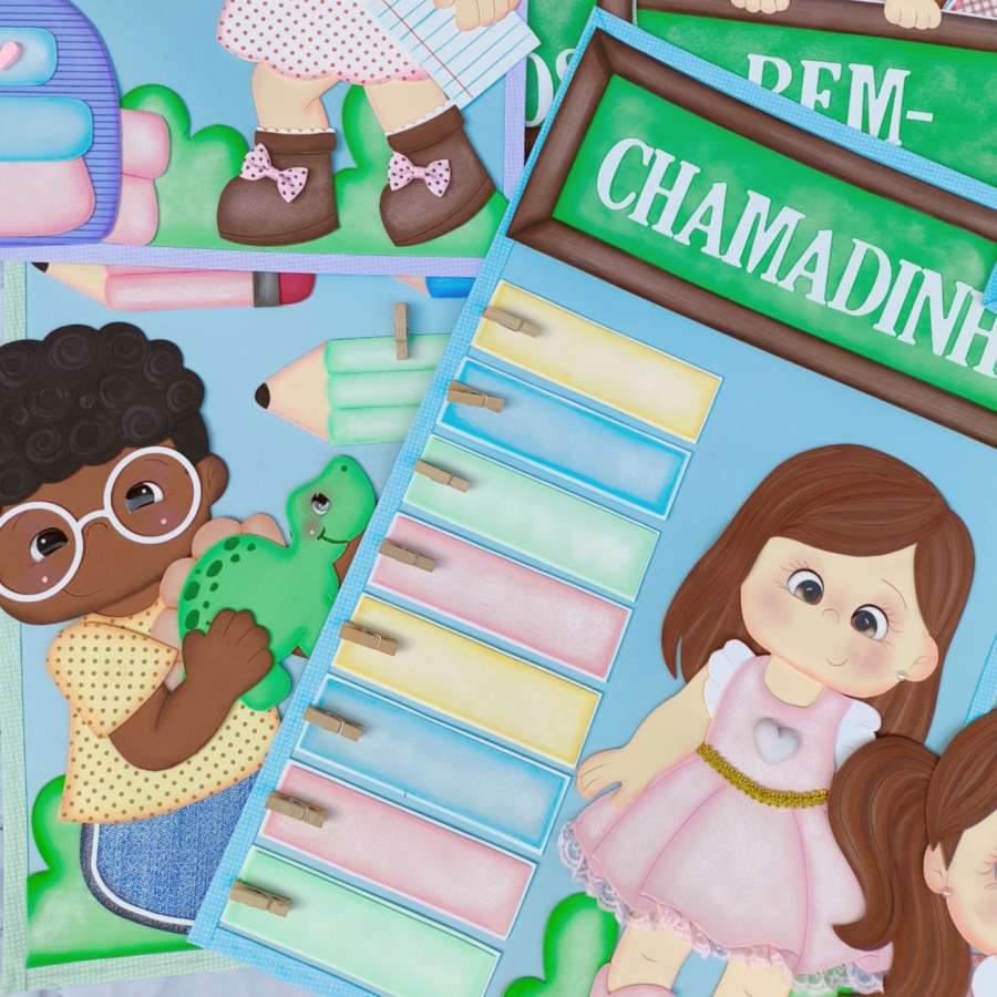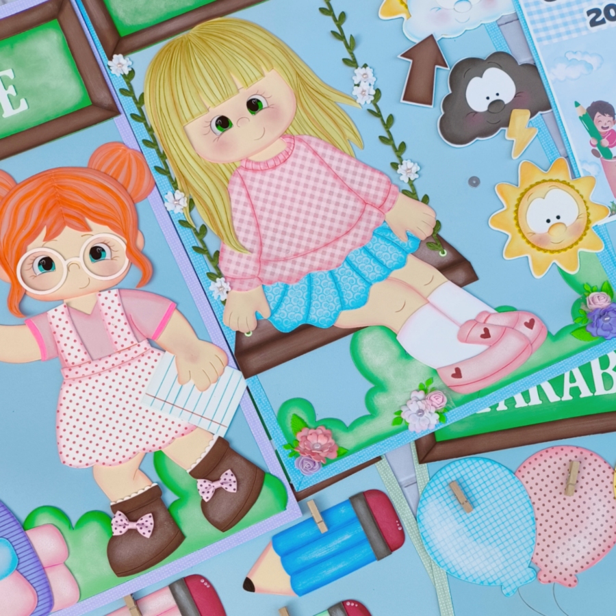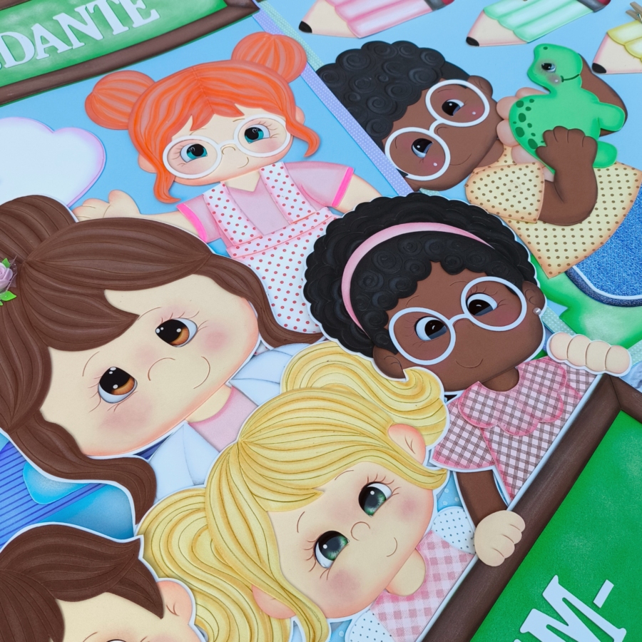 Apostila em PDF com moldes para a montagem de um lindo kit sala de aula com 7 painéis no tema Crianças da Escola